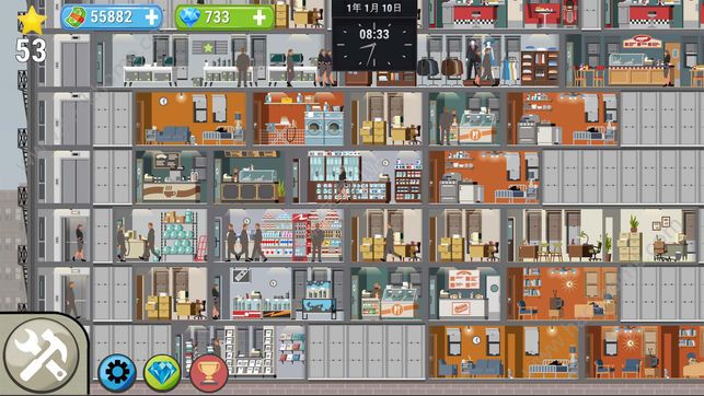 首先你需要招聘建筑工人来建造大楼的地板、管道、电网以及电梯……让你的大楼更高,拥有更多房间。