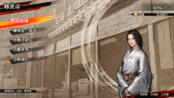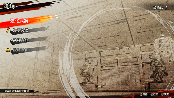 各设施(道场、打铁铺、杂货店、馬廄)均有「设施Lv」,可消耗金钱及资源提升Lv来强化其功能。