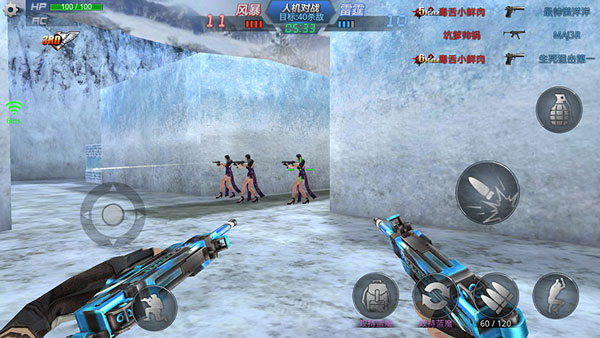 游戏画面左下角有一个圆圈状的虚拟按钮,右下角有个未显示的虚拟按钮,玩家通过滑动虚拟按钮控制人物的动作。其中左下角的虚拟按钮控制移动右下角的虚拟按钮控制准星和射击。同时,在画面左上角设置按钮中有战绩查询、游戏设置、键位设置功能,左下角有蹲下按钮,画面右侧分布有跳跃、切换武器、换子弹、扔手雷等按钮。