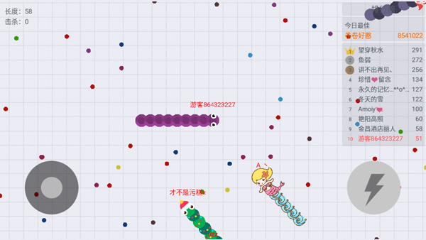 1.控制摇杆走位你的小蛇,吃掉地图上彩色的小圆点,就会变长哦。