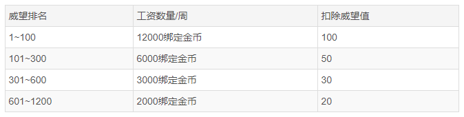 游戏世界中所有符合江湖威望条件的玩家,每周都可以领取一定的绑定金币的工资,每个月领取最多价值500元的绑定金币,领取工资时会扣除一定的江湖威望,详细工资情况如下图所示: