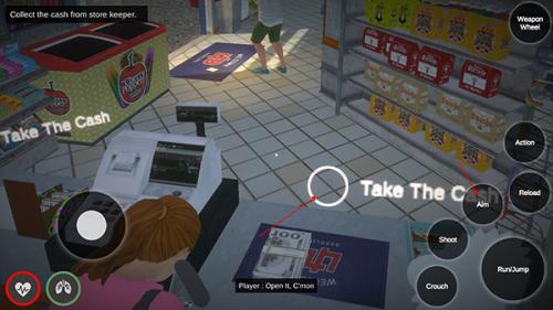 2、左下角按钮可以控制角色自由移动,右侧屏幕滑动调整视野和方向,左上角是当前的任务,需要在超市内收集钞票。