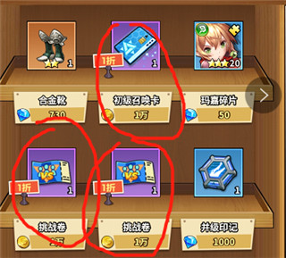 前期商店里的4星狗粮在自身金币大于1000万的时候,可以购买,10w的进阶石必买,2w的普通寻宝卷买,1w的初级召唤卡(10连可以出金闪闪等光暗核心英雄,也可以出2个五星英雄)和挑战卷,刷出的300钻魔力宝石都买,其他的不买。