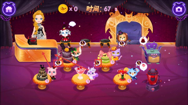 2、在甜品店界面,观察顾客头顶需求图标,将对应顾客拖至美食处,满足订单要求。