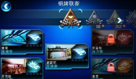 通过点击左右箭头,可以看到更多的联赛,分为铜牌联赛,银牌联赛,金牌联赛,白金联赛,钻石联赛,VIP联赛,专业氮气加速系列赛,精英氮气加速系列赛,全明星氮气加速系列赛,超速杯赛和Ashpalt终极杯 11个不同难度的生涯挑战关卡,每一个关卡有5种不同地区不同比赛类型的赛事。