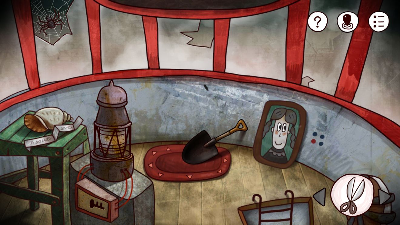 2、到达灯塔2楼,注意:左边墙上的纸里面的内容有了变化。依然是是开门的线索,但是已经变成了另外一扇门的。之后前往3楼,得到一把铁锹;之后下楼出门前往工厂,进入后捡起地上的铁球,此时可以发现左边的地上多了一个盒子(之后回来再处理)。