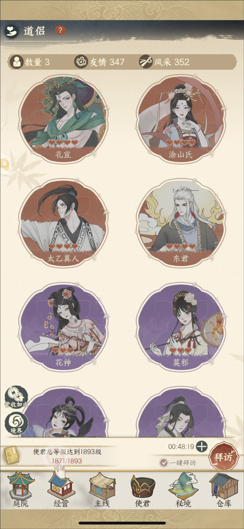 1、道侣友请:代表与掌柜的友情关系,友情值越高,仙童营收越高。