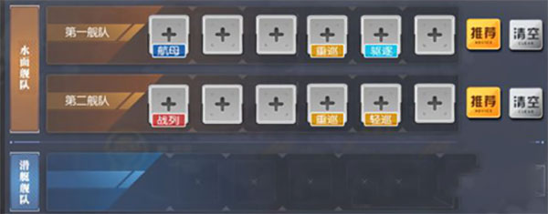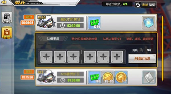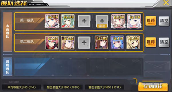 2、队伍搭配:第一1队道中,第2队BOSS,1队刷全图时候旗舰注意血量,血太低时候可以将补给放旗舰位,等级要求,100即可。