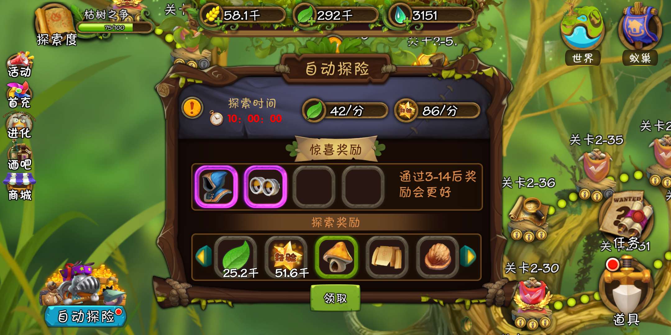 1、小蚂蚁帮各位指挥官把之前关卡探险中的战利品做了优化,所以在新的探险过程中,除了精英关卡,大家只会获得大量绿叶和经验了;