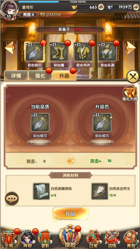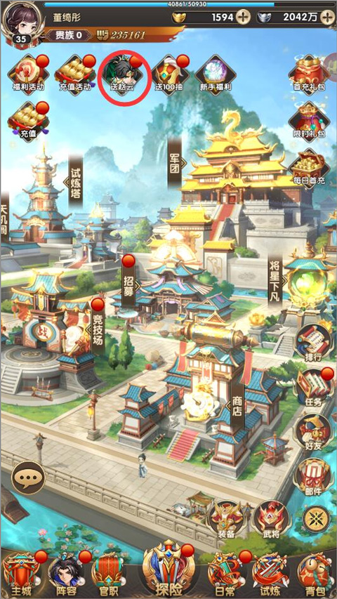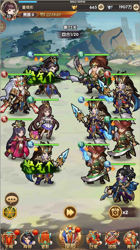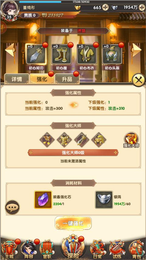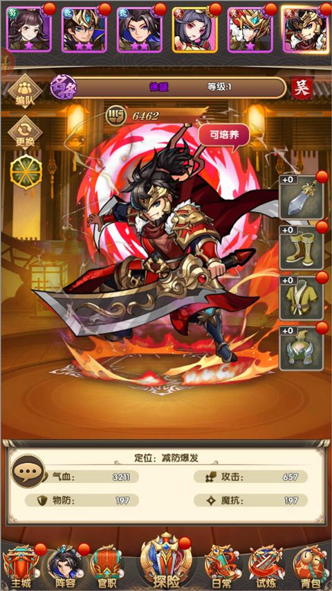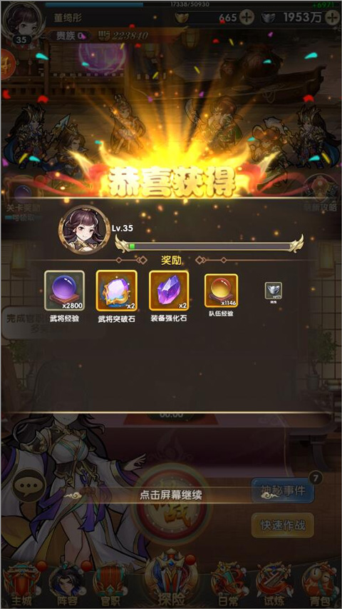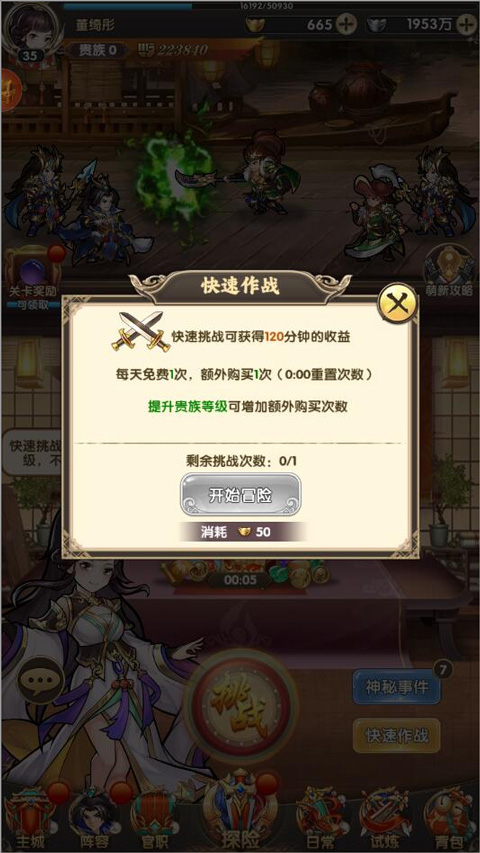 进入游戏招募到武将后就可以参与探险了,前期挑战关卡非常简单,可以轻松获取升级经验。