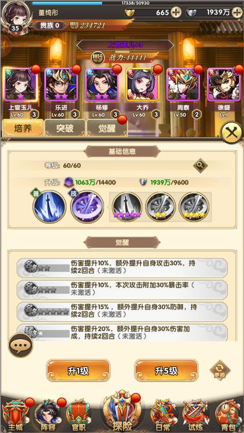 6、最后再对已经获取的武将一一觉醒,这样就可以有效地提升战斗力了。