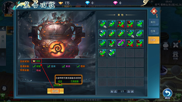 3、还可以在背包内进行装备回收,将低级装备回收为元宝。
