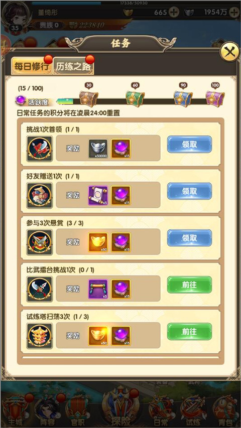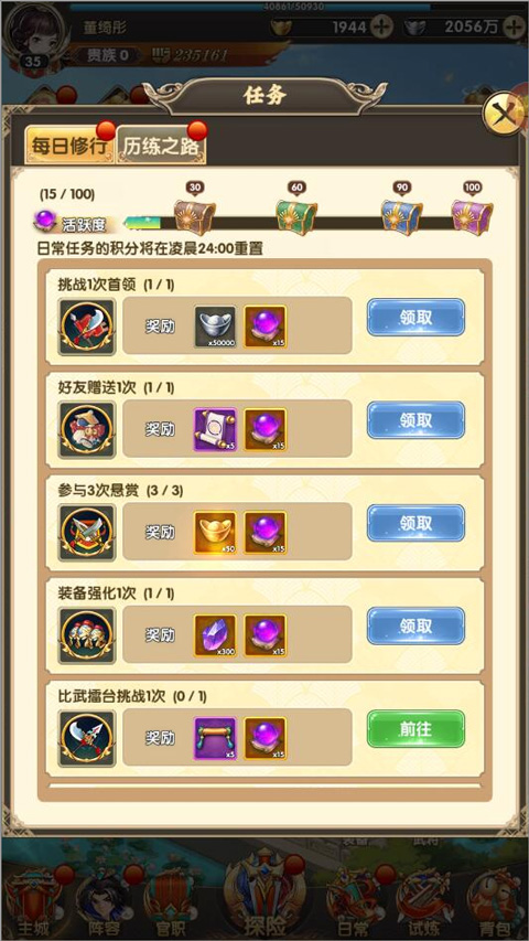 主城任务中心拥有每日修行和历练之路任务,我们可以在这里领取到各种元宝、经验和钻石奖励。