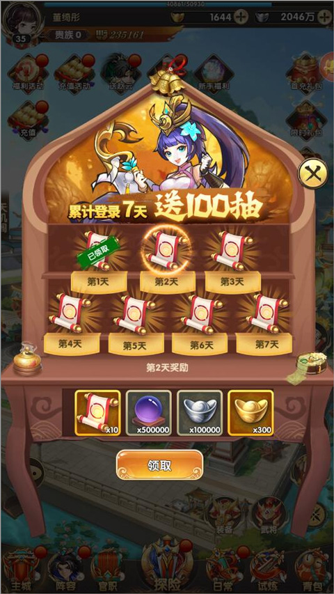 3、接着点击主城中的“送百抽”图标,每天也可以领取奖励;
