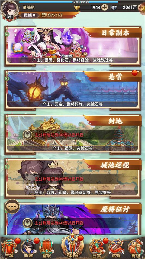 天天迷城是一款融合了二次元风格的策略养成类游戏,游戏拥有丰富的副本、个性化的阵容搭配以及各种试炼关卡,让玩家轻松体验不一样的三国对战,游戏中我们招募到武将后是需要培养才能提升战斗力。