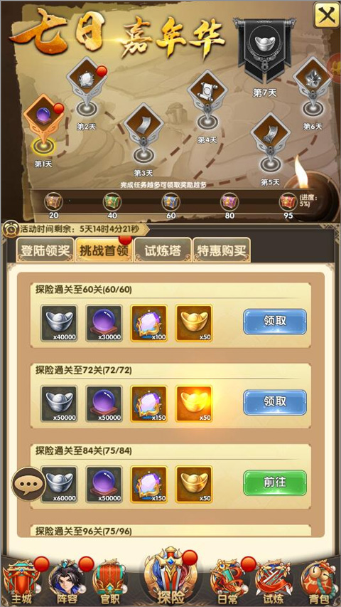 2、如下图,我们可以通过登陆领奖、挑战首领、试炼塔等任务来领取元宝、材料奖励;
