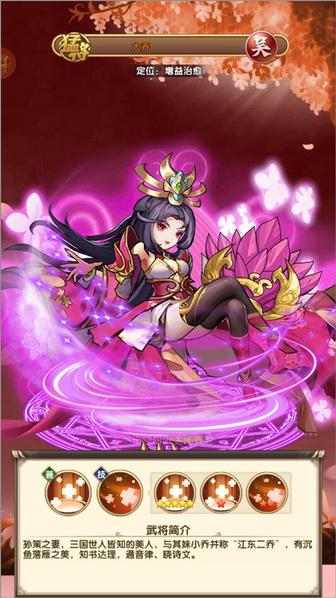 最后为大家推荐的这个是属性叠加阵容,在对战时许褚和庞统可以放在前排,二者可以快速将自身属性拉满,于吉则可以防止对手的秒杀,再加上大乔的增益效果,可以轻松结束战斗。