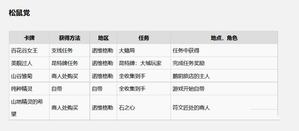 【松鼠党】:由不满现状的非人种族(精灵、矮人)所组成的游击队,有着像是「伏击」:打出时卡背朝上,类似陷阱卡,必须要满足发动条件时,敌方才会知道是什么牌的特色卡牌。(游击队就是要出其不意)
