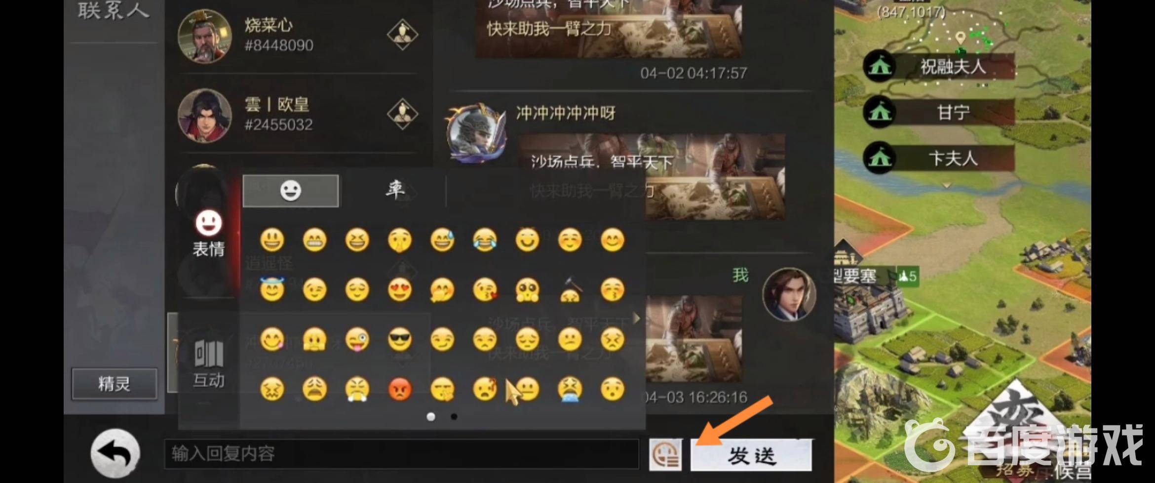 1、先找到聊天界面,点击同盟或者好友的对话框,接着在点击表情这里