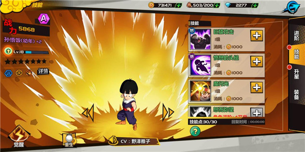 技能效果:孙悟饭幻化成巨猿,攻击当前目标及后排对位目标造成(伤害力*765%+固定伤害)点物理伤害,本次和之后的怒气技提高10%攻击力,该效果最多叠加三次。