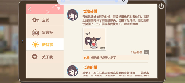 要知道对于胡桃来说,美食可是大于天的,所以,只要给胡桃安排好吃的,亲密度那是噌噌噌的往上涨啊!桃子们可以戳开便利店,每天为胡桃准备不一样的美味食物,当然不同的食物在胡桃食用之后,增长的亲密度也是不一样的。(桃子们可以仔细观察哦)