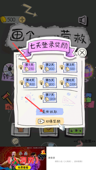 1、进入游戏后先查看【七天登录奖励】,点击【直接领取】获取每日奖励,也可选择【双倍奖励】(观看广告)获取更多资源。