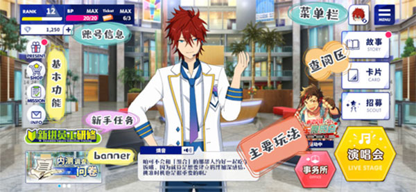 在偶像梦幻祭2游戏中,萌新玩家怎么玩?相信很多玩家都不知道,今天小编就给大家带来了萌新速成攻略,希望可以帮到大家,为了方便大家查看,主要将界面分为以下几个区域(详情看图)。