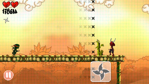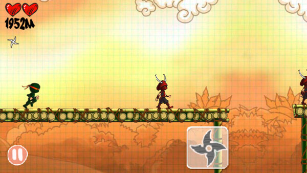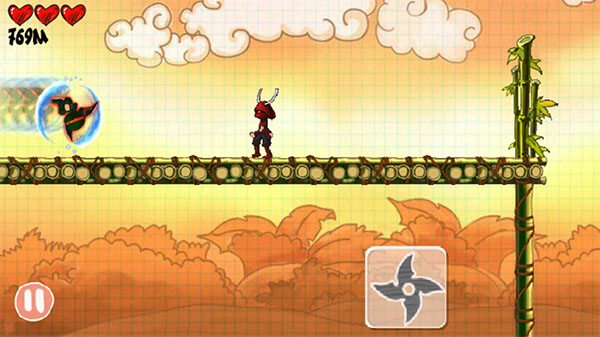 忍者突袭游戏的操作方法非常的简单,玩家可以通过点击屏幕控制忍者的奔跑、跳跃、发镖等动作,点击屏幕是跳跃,点击两次就是二段跳,点飞镖可以发射飞镖,操作就这么简单。忍者突袭一路上还可以收集路边的心形和风车形工具,红心能够补充体力,风车能够加速,游戏结束后玩家可以看到自己的战绩并获取相应的成就,感兴趣的朋友快来下载试试吧。
