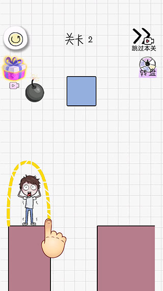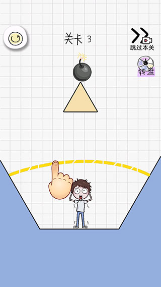 4、进入第三关,可看到人物在谷底,我们需要在他头顶画出一条毛线,
