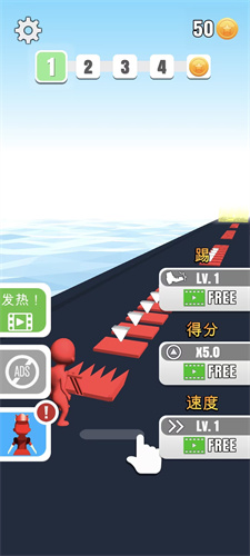 1、游戏通过点击屏幕即可开始关卡挑战,通过划动屏幕控制角色横向移动;