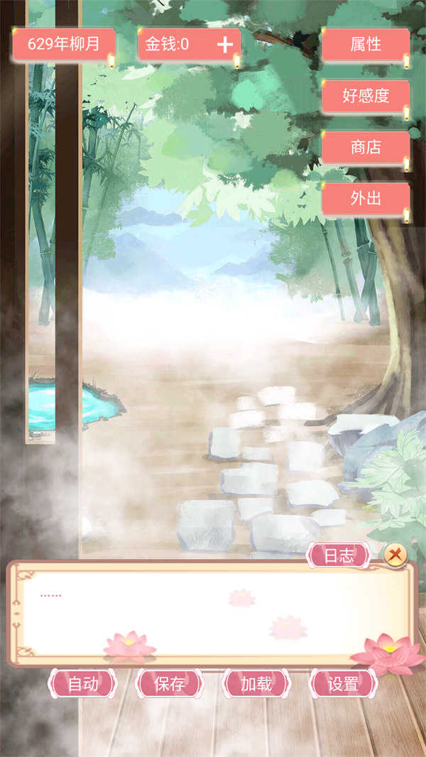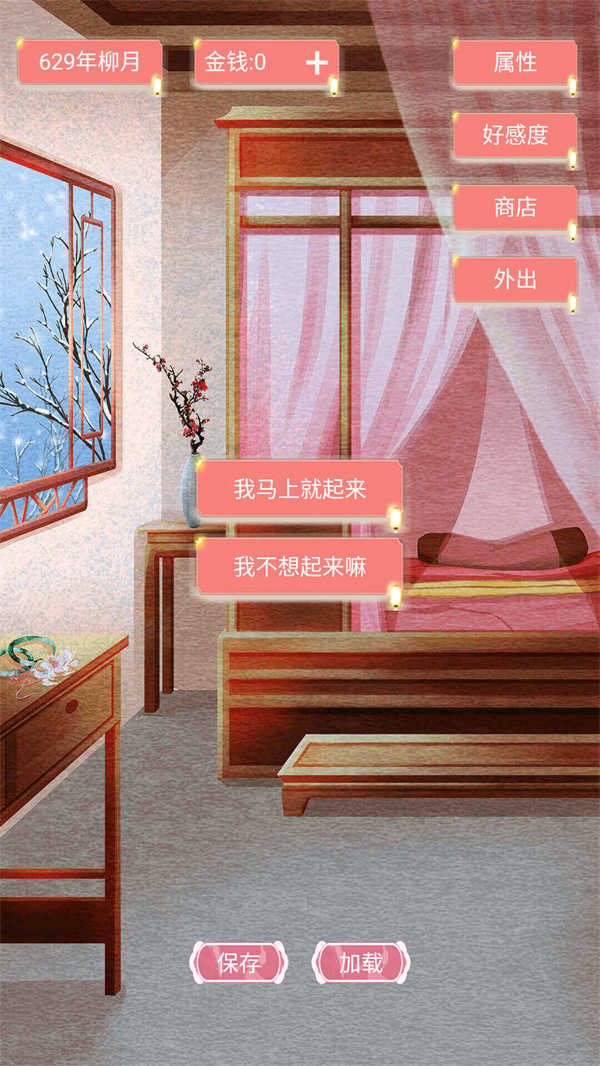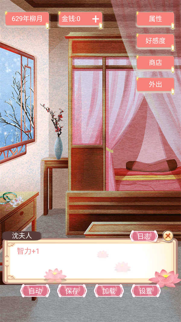 3、游戏正式开始后,会出现新的功能。“属性”可以查看主角角色面板,“好感度”可以查看各个男主对女主的好感度,“商店”可以购买道具使用,“外出”可以推进剧情。