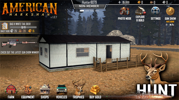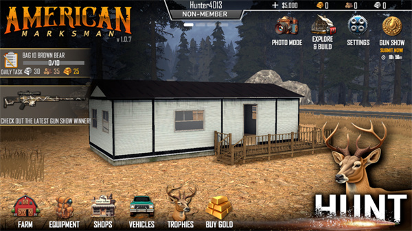 猎鹿人神枪手内购免费版是游戏的优化版本,在该版本中为玩家提供了内置功能菜单,包含游戏加速、无限金币、无限木材等多项实用特权。这是一款沉浸式户外狩猎射击游戏,在游戏中你将成为一名经验丰富的猎手,在广袤荒野中搭建专属营地、追踪野生动物、完成多样化狩猎任务并不断升级装备与技能。