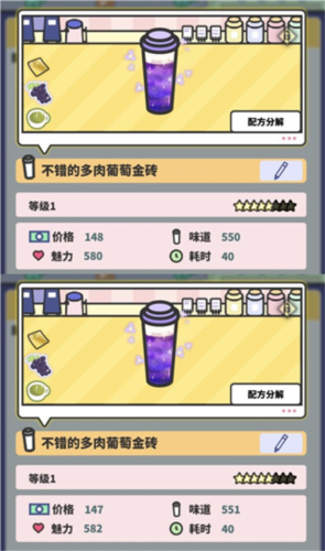 虽然不同奶茶配方的数值会有浮动变化,但是强化版配方的各项数值都要比普通配方的高(耗时除外)。一般前缀为【完美】的配方数值综合来说更好(待考证)。如下图多肉葡萄金砖配方,前缀完美/迷人/美味所对应的配方数值各有侧重。