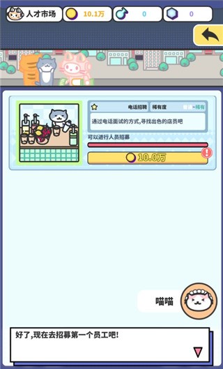 1、你可以外出去去【人才市场】或者在总部【特殊招募】聘请新的猫猫员工哦~
