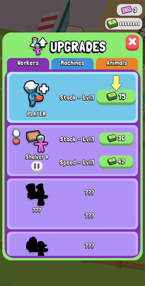 6、挣的钱越来越多之后,陆续解锁更多的货架以及食物品类,把超市做大做强!