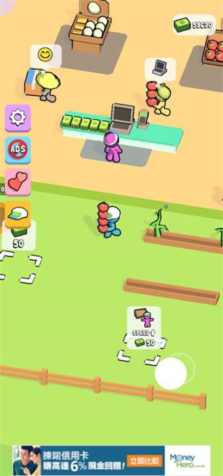 1、进到游戏后,通过滑动屏幕控制小蓝人移动到方框位置,即可使用金币解锁收银台。