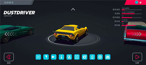 在一开始驶向天际游戏的时候,我们只有一辆车可以控制,不过慢慢的随着比赛的完成,车辆可以进行解锁(以及购买)车辆的右上角会有车辆的一个性能的信息,可以进行查看。