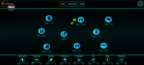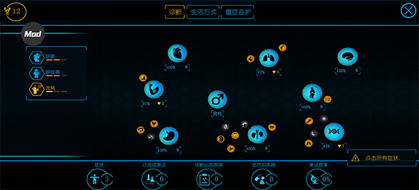 进入透视图,立马可以看到病人的健康状况以及各类初始buff,例如骨骼右下方的黄色负面buff 与神经系统左下方的蓝色正面buff。根据很多负面buff其实可以大大的帮助玩家判断病情方便诊断。而这个病人可以看到,已经成年并且步向老龄,机智的笔者立马意识到,病人的骨骼和肌肉虽然健康值也在下降,但很有可能是病人年龄过大造成的,非疾病影响,因此接下来诊断应该侧重于神经与血液系统。