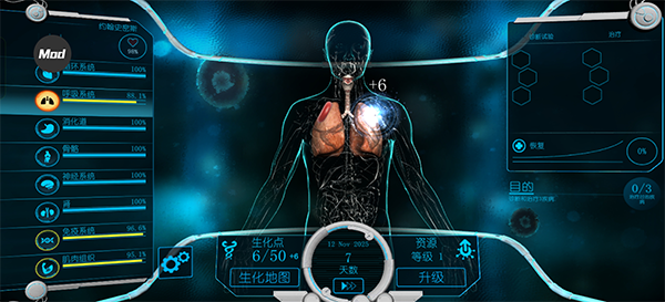 生物点收集的差不多之后就可以开始诊断了(这里建议一进游戏立马进入诊断页面想好下一次做什么检查,需要多少生物点,一旦生物点收集到位便立马开始检查,不耽误病情)。首先可以观察到,果然不出所料,血液循环和神经系统下降的幅度是最大的。选择左侧的症状栏里最严重的肌肉无力症状后,主界面上浮现出一系列可能引发该症状的疾病。呼吸器官健康程度99%并且无下降现象,因此虽然有两个疑似疾病,也可以直接排除。最后多番考虑下,笔者最后决定针对目前较为严重的神经系统进行诊断。