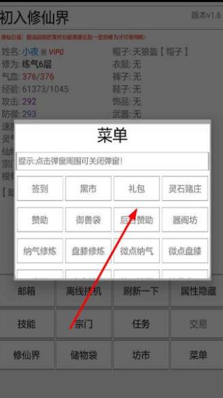 1、进入游戏后首先创建角色,挑选灵根属性和初始门派,在新手村通过完成引导任务来熟悉炼气期的基础修炼操作。