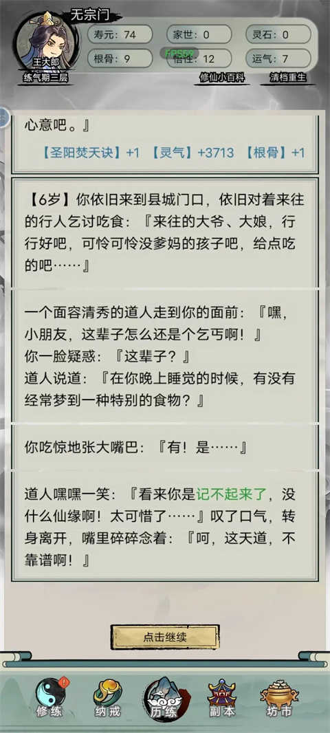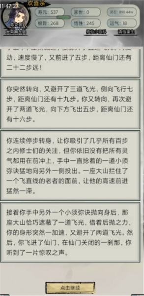 4、游戏中设定了丰富的随机事件,玩家需要应对各种意外情况,体验修仙者的不同人生轨迹。