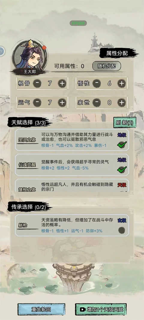 3、在游戏开始时,玩家可以自由选择天赋和属性点分配,打造独一无二的修仙者角色;