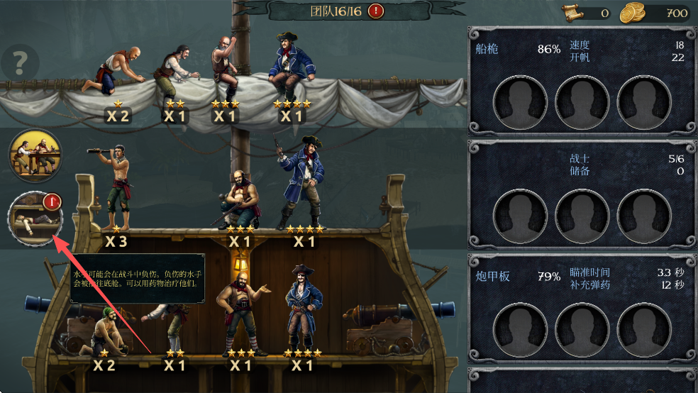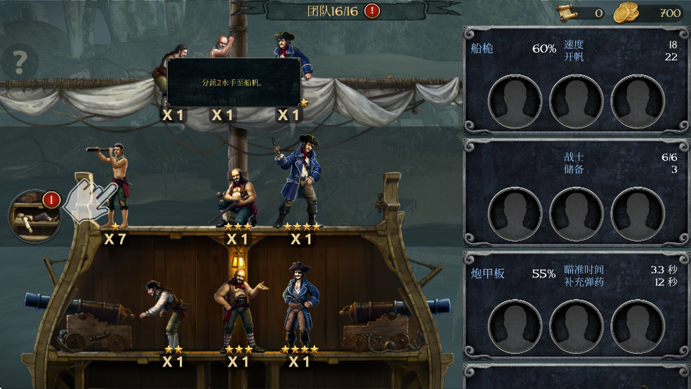 你可以分派任意舰船上的海盗负责船帆、甲板或武装大炮,拖动2水手至船帆,加快船只航行速度。