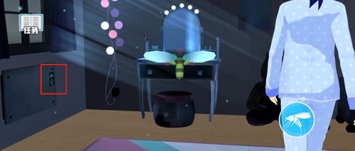 2、当我们完成其他的三个任务时,等待小姐姐再次入睡,来到房间右侧窗户的右下角靠梳妆台的窗户处,找到空调的开关;
