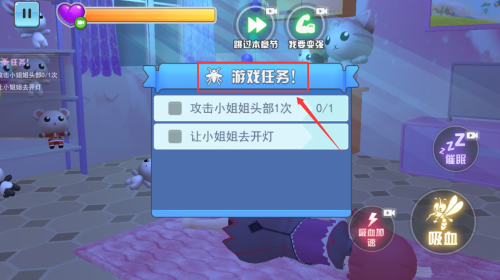 1、打开进入开始游戏,浏览游戏任务,这个关卡的任务是攻击小姐姐头部1次,让她去开灯。