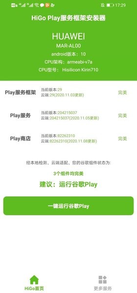 1、下载并安装HiGoPlay谷歌安装器后打开应用,首页会显示当前设备的Google服务状态。若“设备服务”“商店”“服务框架”三项均未安装,则需进行修复。