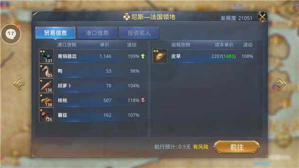 而右侧显示的是你已持有的货物信息。例如,图中“1485”是你此前在其他港口购入皮草的成本价,“2207”则是当前在尼斯的出售价格。利润即为2207减去1485。需要注意的是,只有当你实际持有某类货物后,才能在任意港口查看其出货价。此外,地图上部分港口显示为“未知”,说明你尚未抵达过该地,无法查看其行情。因此,跑商前务必亲自航行至所有港口,将其解锁,否则无法全面掌握市场动态。