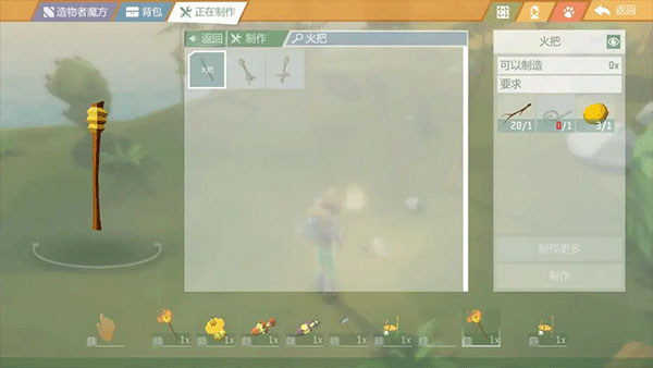 制作火把仅需3种材料:1根木棍、1条任意绳子和1个树脂。树脂可通过砍伐树木或使用小刀在橡树上提取获得。