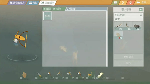 所需材料包括:1根木棍、1个棍弓、1颗石头和1片任意树皮。其中木棍与石头可直接拾取,树皮需砍伐树木获得;棍弓则由4根木棍和1条绳子合成。集齐所有材料后即可制作取火弓钻。