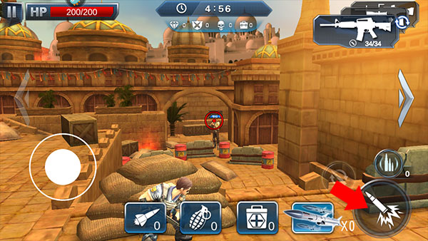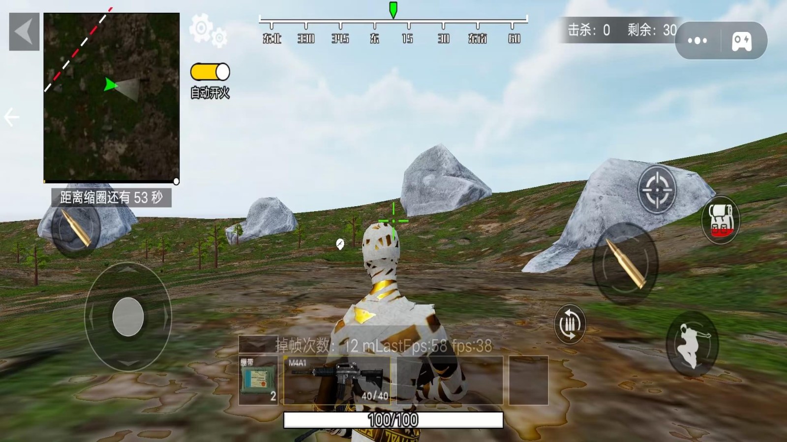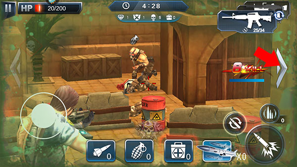 3、进入游戏后通过拖动屏幕来瞄准敌人,点击右下角的开火键即可移动出障碍物进行射击。